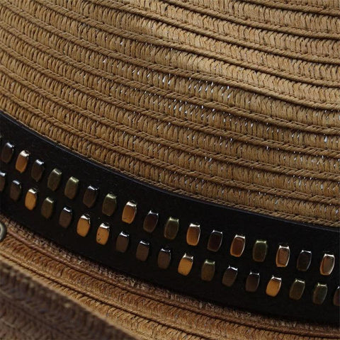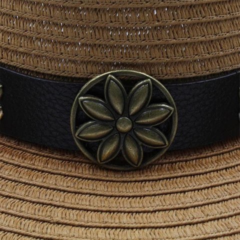 Stilen fra antikke cowboy hatte ses her. Dens kurve giver den en vild vest stil. Den blomstrede læderrem mindsker ikke dens charme.