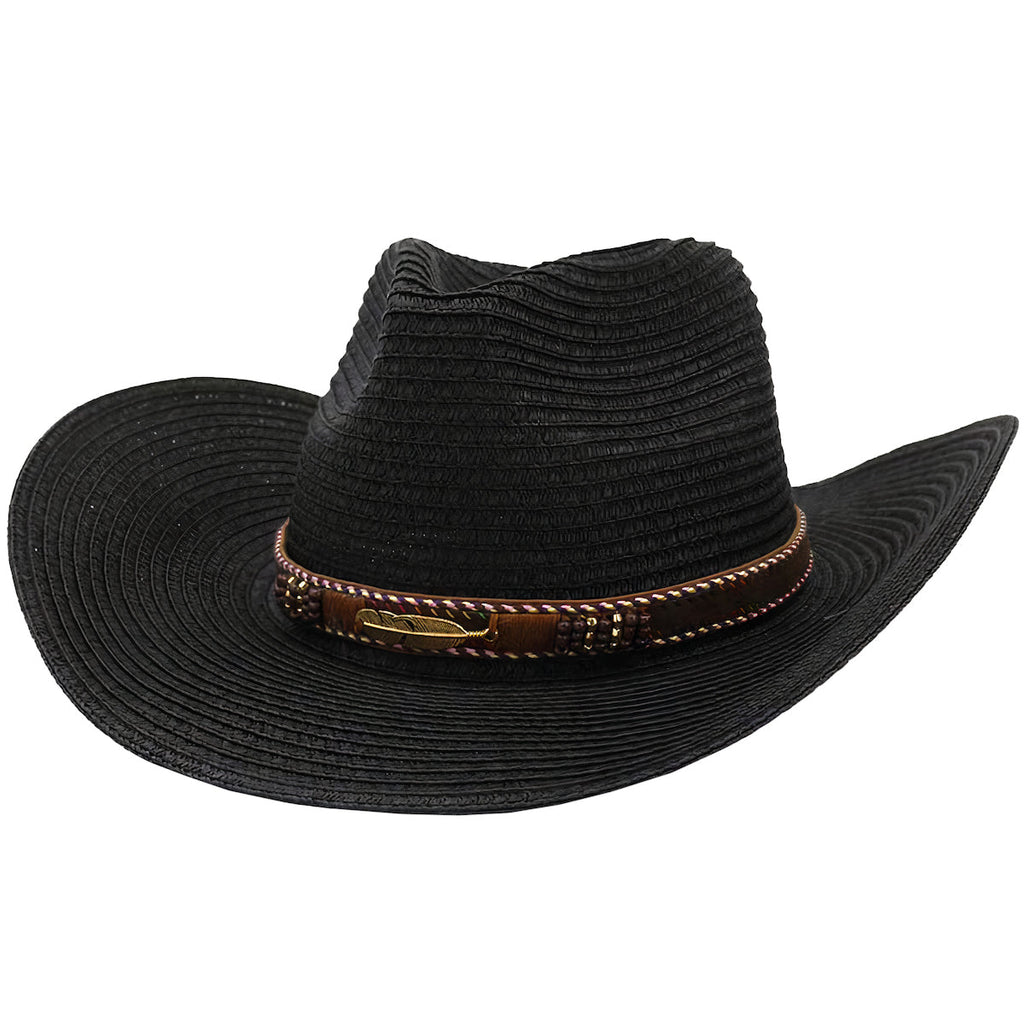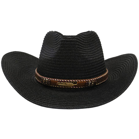 Trilby sort stråhat er en elegant, letvægts vævet hat, som du vil nyde at bære. Cowboy-look og dekorativ hovedbånd gør denne hat til et alsidigt modeaccessoire. Du kan bruge det til en formel lejlighed eller som en del af hverdagen.