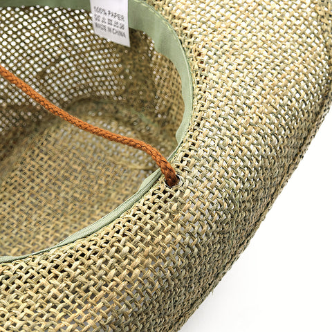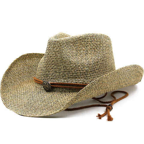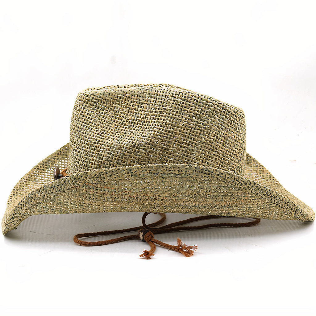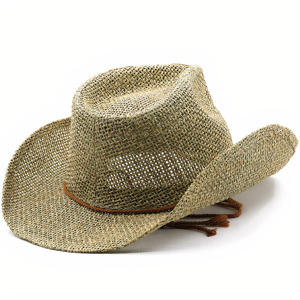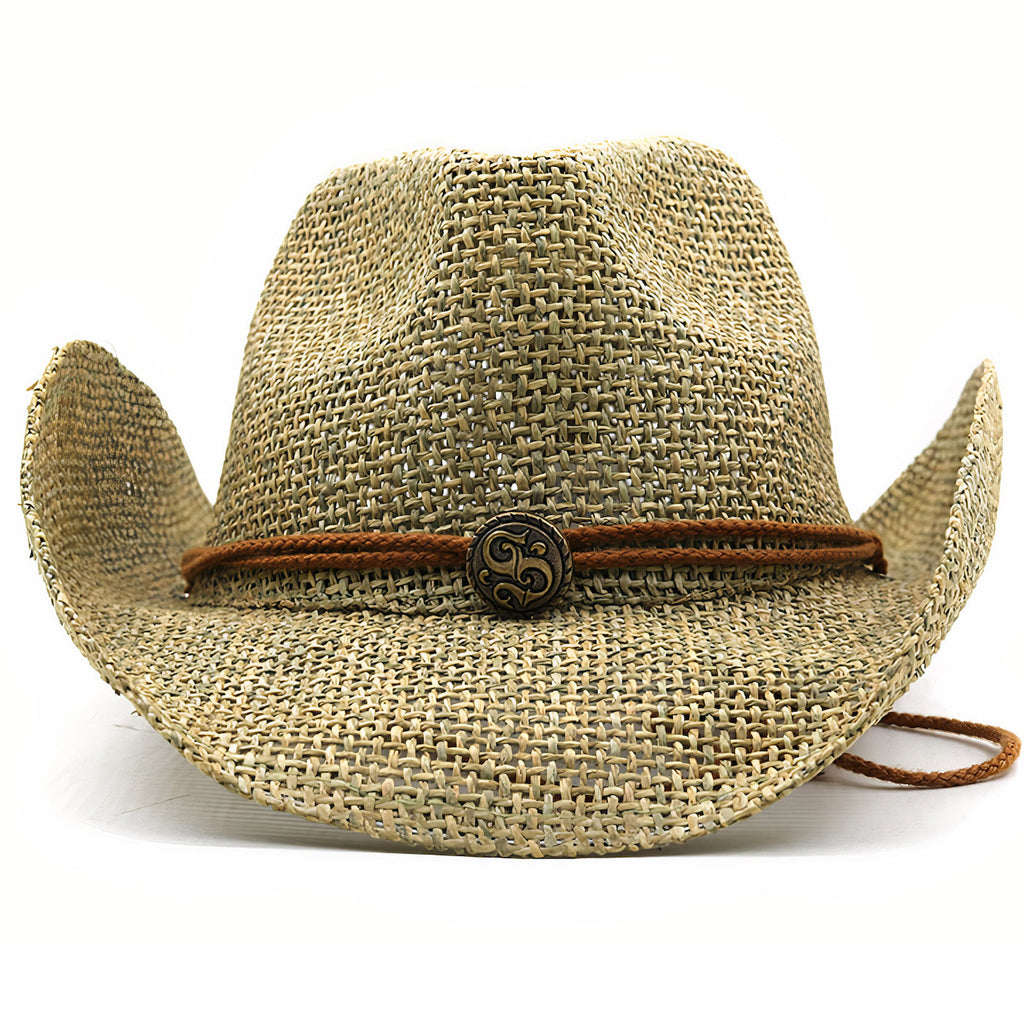 Her er en stråhat, der ikke mangler maskulinitet. Dens cowboy-hat form er meget fremtrædende og helt forventet her. Det bevises af de skarpe, hævede strimler på venstre og højre side og de kraftige indrykninger i toppen af hatten. Denne hat passer perfekt til at fuldende dit outfit med et unikt modeaccessorie.